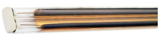 Approximately 70% of the input power is converted into radiant heat, the emissivity of the unit being that of the wire spiral, approximately 0.8 when in use. Twin tube medium wave elements are constructed in a figure 8 quartz section, which results in high strength design, extra rigidity over long lengths up to 4meters. The twin tube design offers a number of advantages including rigidity, robust, but also the ability to manufacture many different configurations. Terminating leads at one end is a clear advantage over other types of heating elements, as all leads are terminated at one end, making installation simple and inexpensive. No requirement to run extra cables.