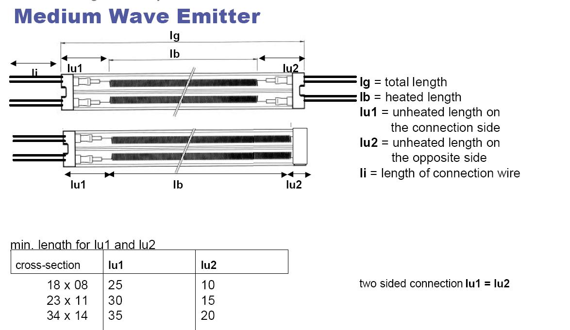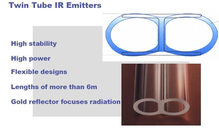 Approximately 70% of the input power is converted into radiant heat, the emissivity of the unit being that of the wire spiral, approximately 0.8 when in use. Twin tube medium wave elements are constructed in a figure 8 quartz section, which results in high strength design, extra rigidity over long lengths up to 4meters. The twin tube design offers a number of advantages including rigidity, robust, but also the ability to manufacture many different configurations. Terminating leads at one end is a clear advantage over other types of heating elements, as all leads are terminated at one end, making installation simple and inexpensive. No requirement to run extra cables.